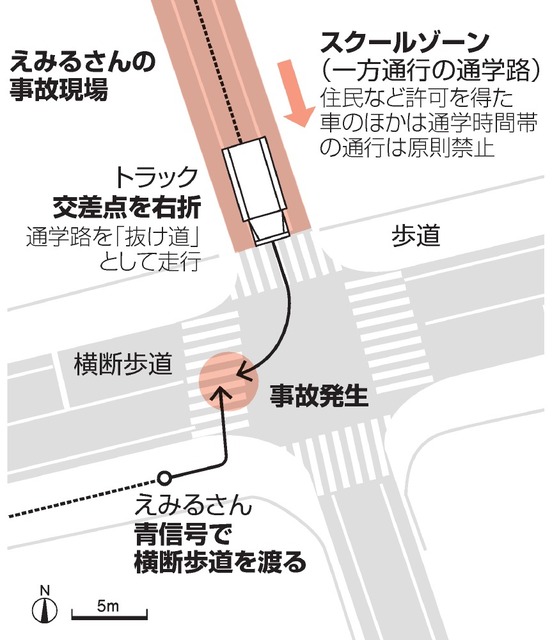 東京都世田谷区中町付近の交差点。えみるちゃんは当時10歳、小学5年生だった。